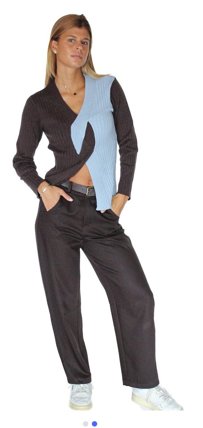 Un capo raffinato e originale, realizzato in morbida lana merinos che garantisce comfort e calore. Il design è impreziosito da un elegante gioco bicolore che, grazie al motivo a costine, crea un delicato effetto a onda. Lo scollo a V riprende la linea dell’incrociato, pur non essendolo, conferendo dinamismo e femminilità alla silhouette. Versatile e sofisticata, è la maglia perfetta per dare un tocco ricercato ai tuoi outfit quotidiani o più eleganti.